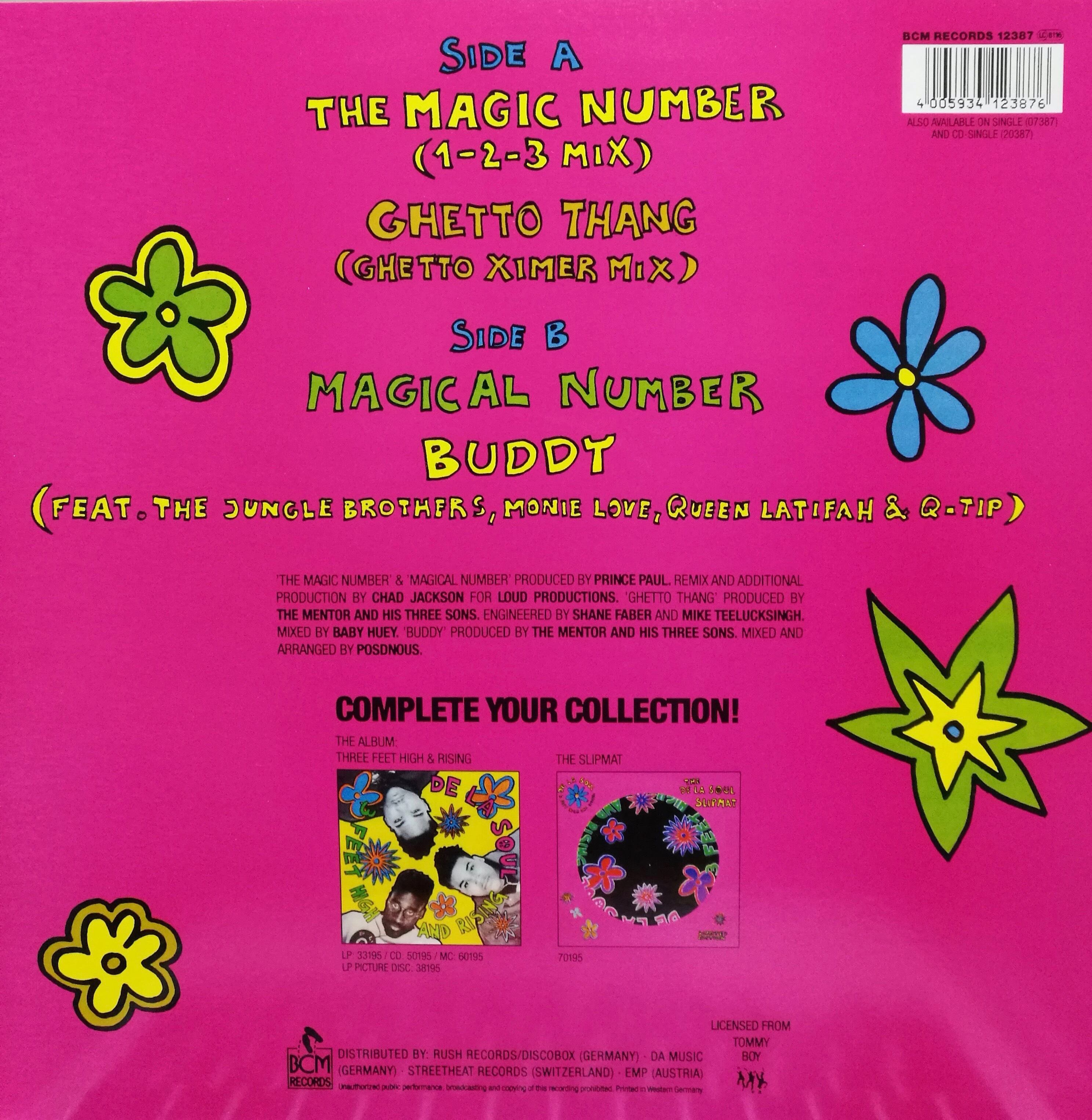 Pos、Trugoy、Maseoのロングアイランド出身のヒップホップトリオDe La Soulの大名作「3 Feet High & Rising」からのカットシングル。Jungle BrothersやQ-Tip等が参加したTaana Gardner「Heartbeat」使いのパーティージャム「Buddy」、Chad Jacksonによるリミックスバージョン「The Magic Number (1-2-3 Mix)」と「Magical Number」、Spoonie G「Spoonin Rap」のトラックを使ったA2「Ghetto Thang(Ghetto Ximer Mix)」とどれも使えます!!