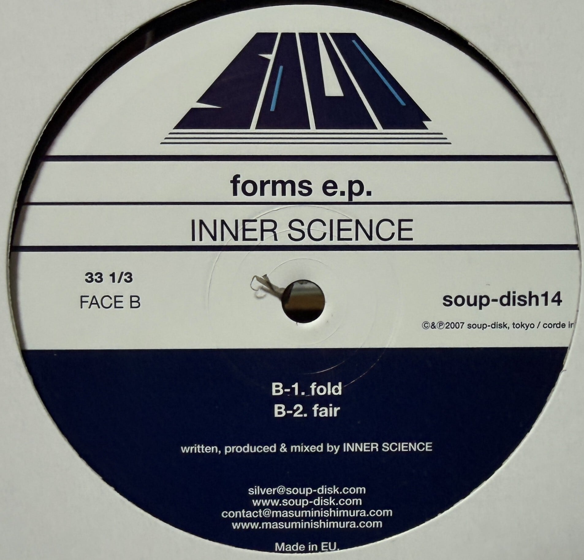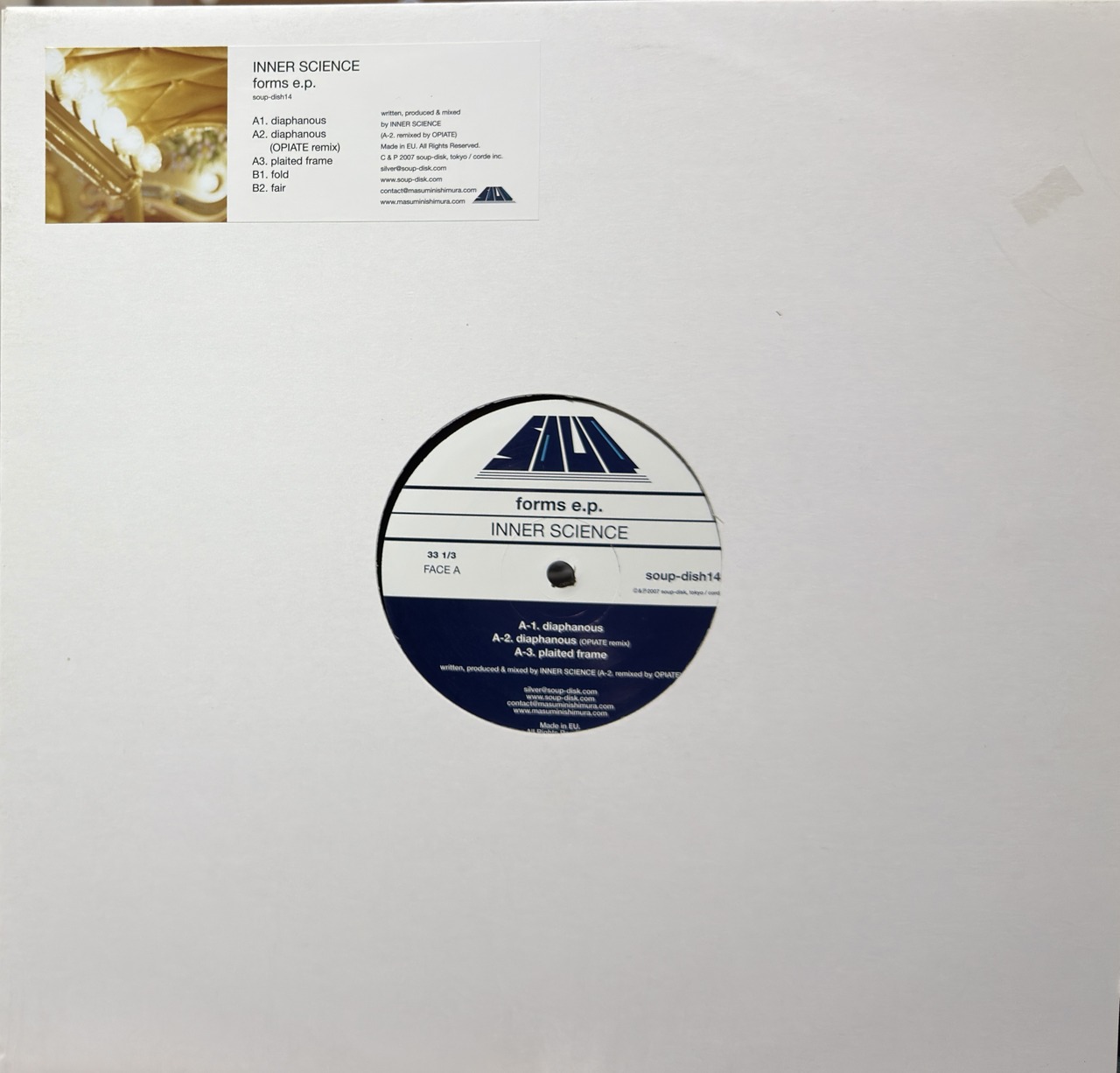 自ら主宰したONEOWNER RECORDSを閉鎖し、名門SOUP-DISKからのリリースに全てを捧げたブレイクビーツ・マスターINNER SCIENCEによる、入魂のアルバム"FORMS"からの祝ヴァイナル・カット。淡雪のように煌く美麗シンセと、細かに組み上げられたブレイクビーツとの組み合わせによるインスト流麗トラック・オリジナルA1を、美麗音響工作が施された透明トロニカで一世を風靡した巨匠OPIATEが、ドリーミー・ブレイクスへと仕立て直したA2!!、逆回転アンビエント・サウンドから一転、野太いブレイクビーツが叩き込まれていくA3!!などを収録です。