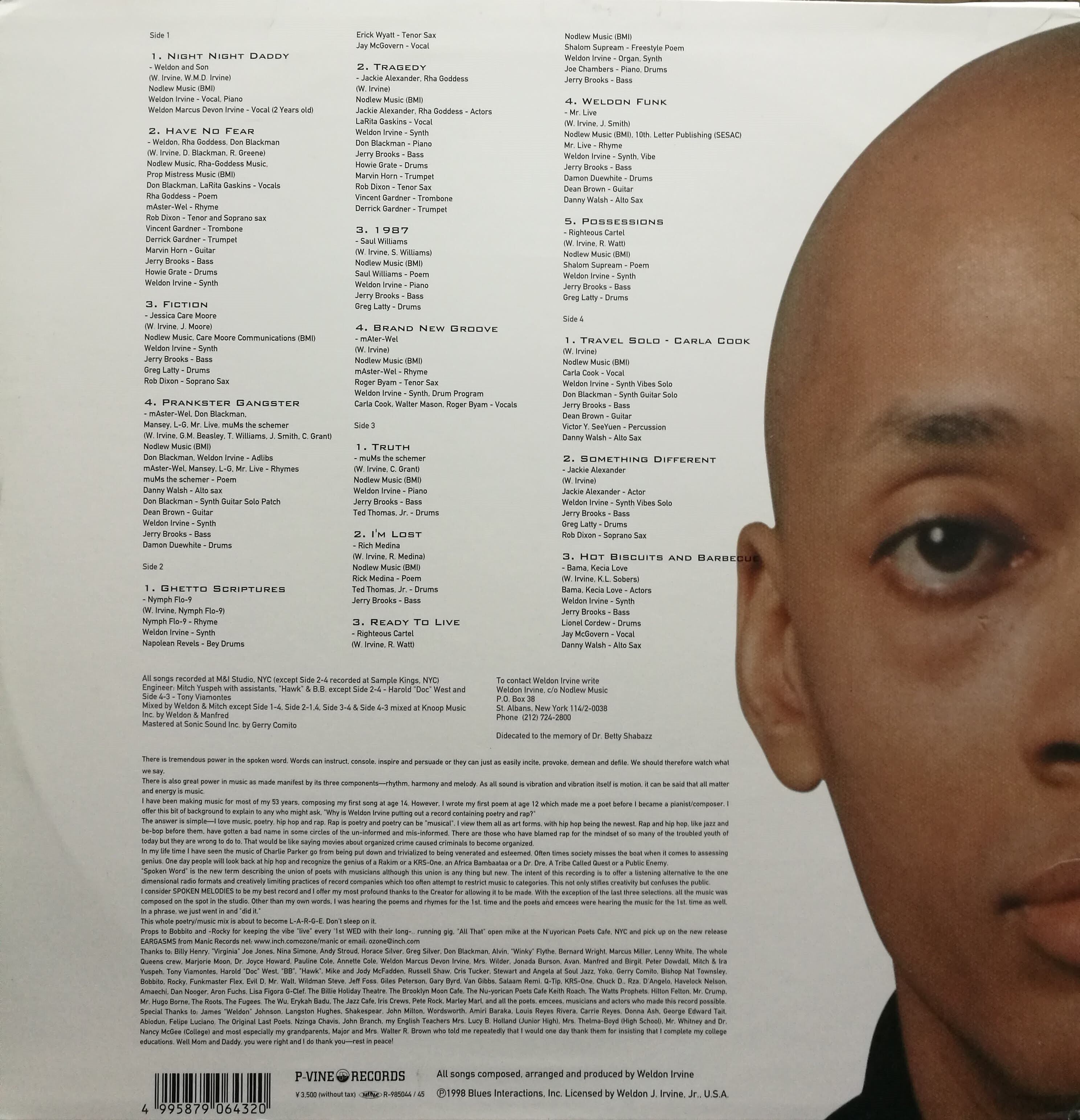 『Time Capsule』や『Spirit Man』等の名作にMos Defとの共演等でHip Hop層にも知られるジャズ・ピアニスト、Weldon Irvine。彼が97年に自身のレーベル【Nodlew】からリリースしたポエトリーアーティストとコラボしたアルバム!コチラは国内【P-Vine】ライセンス盤。メロウなピアノに自身の子供と微笑ましい会話を乗せたA1「Night Night Daddy」を始め、JBファンク路線のA2「Have No Fear」、Bernard Wright / Haboglabotribin'のベースをループしたA4「Prankster Gangster」、硬質なドラムブレイクから始まるメロウジャズトラックのB1「Ghetto Scriptures」、ビートは完全にドープHip HopなB4「Brand New Groove」、Rich Medinaを迎えたC2「I'm Lost」等、アルバム通してドープなポエトリージャズ作品!渋い!