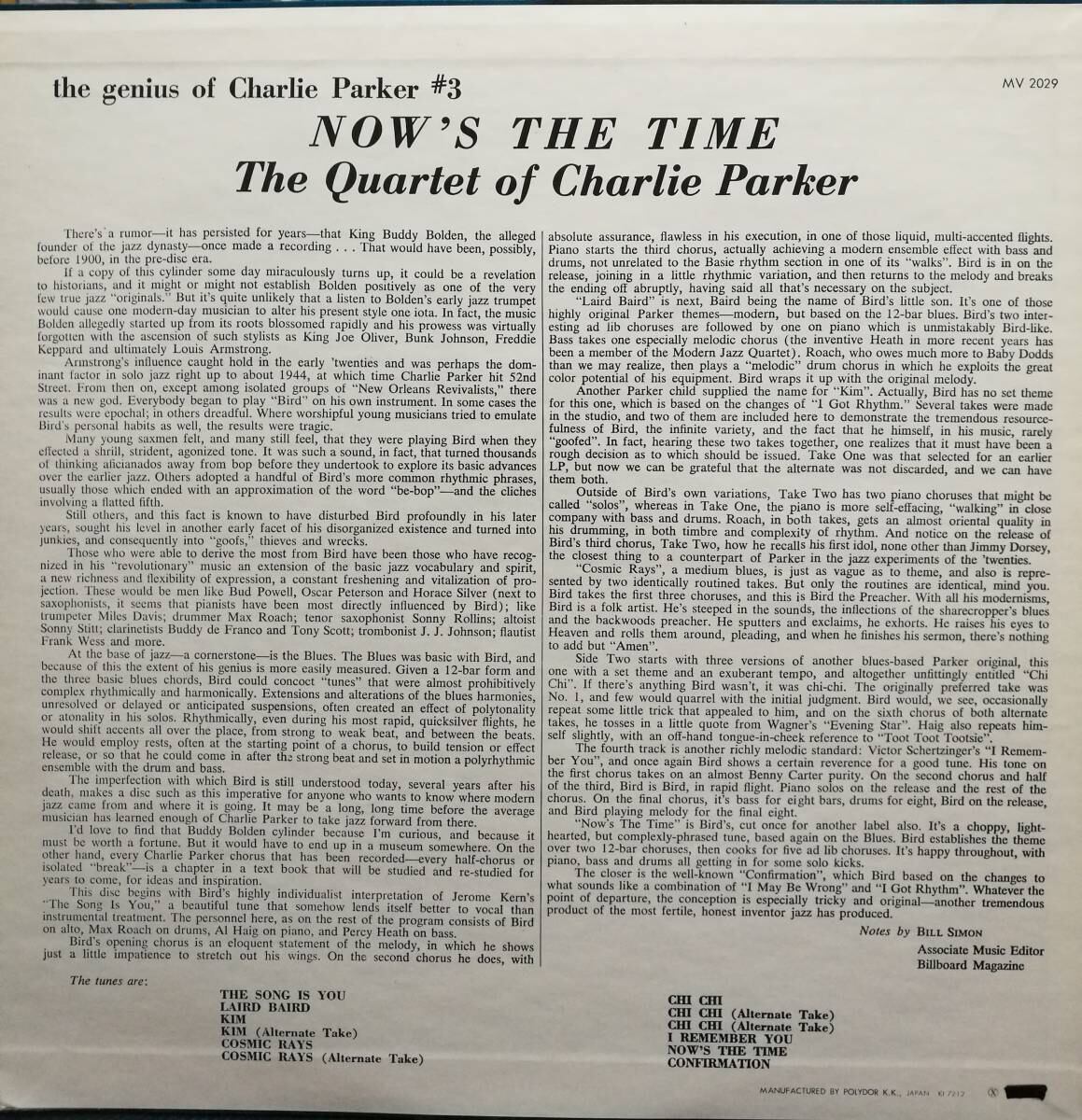 創造性豊かな天才サックス奏者:Charlie Parker率いるQuartetとして老舗[Verve]に残した57年の名作「Now's The Time」。彼の息子の名がタイトルになった「Lairnd Bairnd」や「Kim」に加え、タイトル曲の「Now's The Time」、定番の「Confirmation」など、魅惑のパーカーフレーズが各々に吹き宿り、最後の偉大なレコーディングとして語り継がれる不屈の名作。