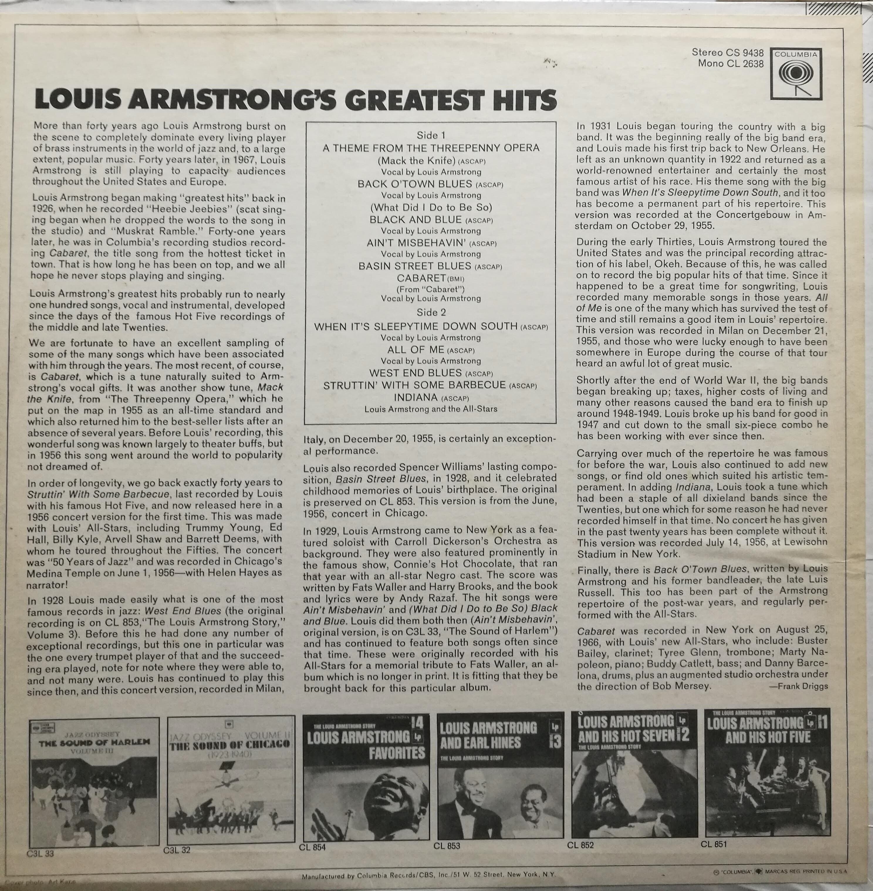 名曲"A THEME FROM THE THREEPENNY OPERA"収録。「サッチモ」ことルイ・アームストロング、コロンビアからのベスト・アルバム!!