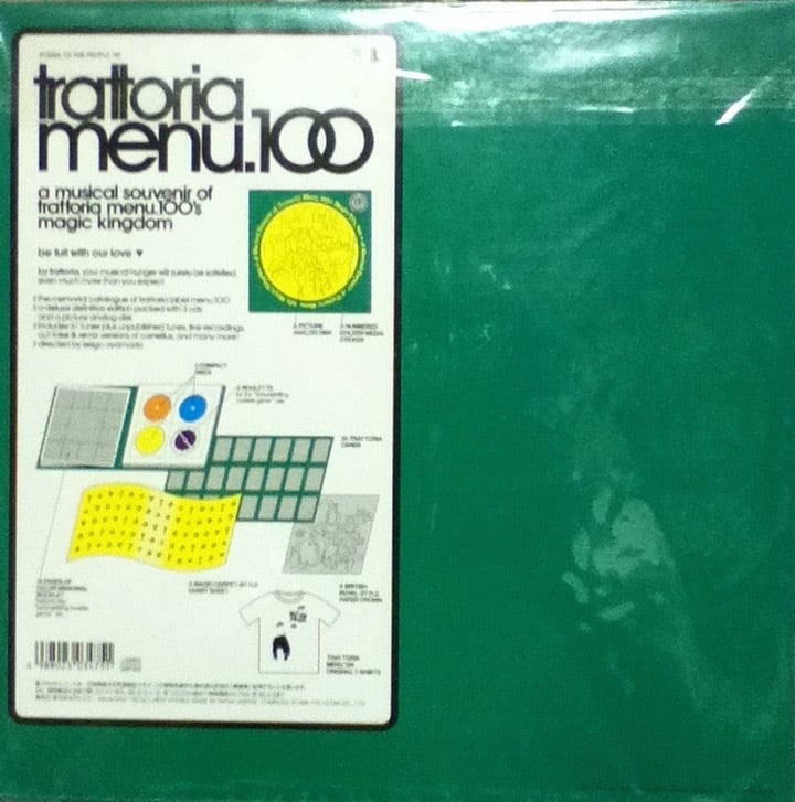 小山田圭吾が設立したトラットリア・レーベルの100枚目を記念して作られたCD3枚+ピクチャーLP+Tシャツ(欠品)による豪華完全限定セット(1996年)。レーベル初期~中期のすべてを集約した究極のベスト。レア音源を中心としたアナログ盤だけでも一聴の価値有り!<限定シリアル番号入り>