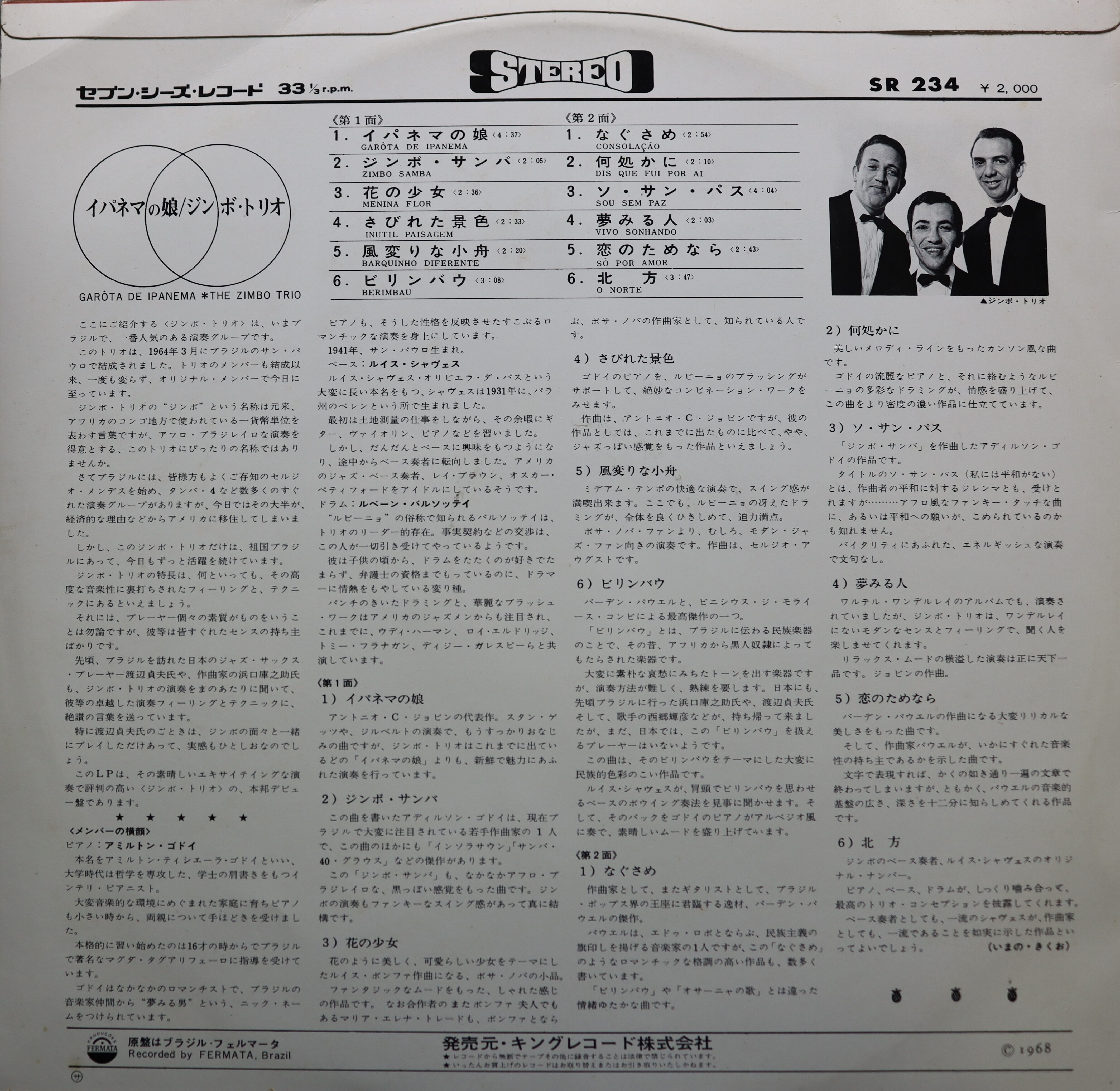レアなペラジャケ盤!卓越した技術を持つブラジルのジャズサンバ・トリオによる名作。アグレッシヴなA2やメリハリの効いた定番曲A1、渋味のあるB1など何れも流麗なピアノを軸としたジャズボッサが並びます。
