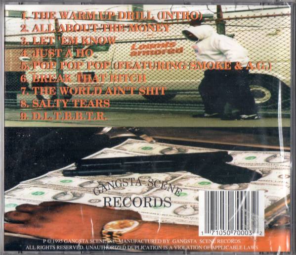 ラスベガスの激レアな『MARLON MONEY』の95年の1STデビューアルバム!! 早い者勝ちです!!!! 知らない人がほとんどだと思いますが、昔はむちゃくちゃ悪いGANGで刑務所に出たり入ったりしていて、今は更生して音楽に専念しているらしいです。 2曲目ALL ABOUT THE MONEYはギターが気持ちよくひびくトラックに、うねるシンセが途中から絡み、STREET感溢れるラップがマイナー度を引き立てるGANGSTA FUNK!! 3曲目LET ME KNOWは奇麗なピアノソロから始まり、頭からDELSHEIA嬢が歌い、G-MANのようなオシャレなベースラインにまったりとラップするミドル!! 4曲目JUST A HOは雰囲気満点なJAZZYなトラックに気持ちよくラップする大人な名曲!サビでは自身が歌います! 5曲目POP POP POPはFEATにSMOKE & A.G.を迎えたシリアスなシンセが響くGANGSTA チューン!!! 6曲目BREAK THAT BITCHがヤバいんです!BPM速めのオシャレなトラックに、のりのりでラップするフロアチューン!サビではトラックオンリーになる所がセンスの良さを感じます!!! 7曲目THE WORLD AINT SHITはピアノが響くトラックにシンセが加わる名曲で、展開が多いトラックにやられます! 8曲目SALTY TEARSも凄いんです!!頭からKITTY嬢が優しく歌い、レイドバックしたトラックに、甘~くMARLONがラップし、サビでは再びKITTY嬢が壮大かつ甘~く歌い上げる!!最高のメロウチューン!! ラスト9曲目DLTBBTRは体が自然に動いてしまうBPM95くらいの最高のミドルで、サビではDELSHEIA嬢とMARLONが歌います!!鬼レア盤!!!!